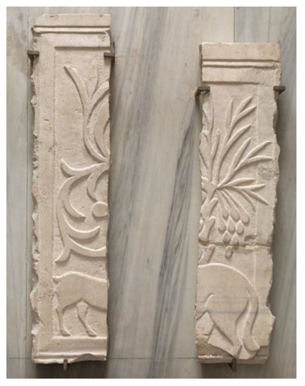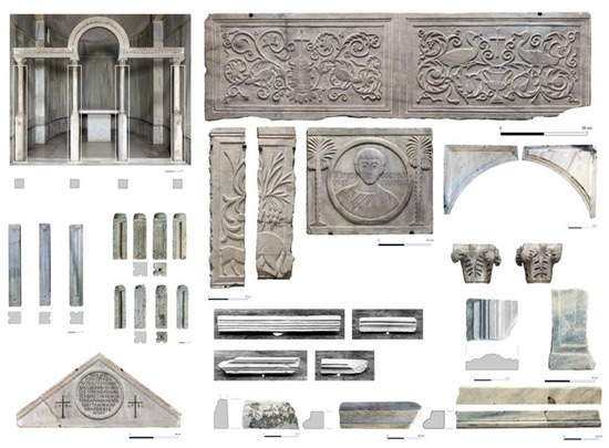 Only a few elements of these marble furnishings survive, largely located in the oratory of San Prosdocimo, and today decontextualized from their original location (Figure 3). Based on their function, we can distinguish three chancel screen panels, five piers, four pier colonnettes supporting an architrave with an inscription, one cymatium, and one triangular door lintel with an inscription.