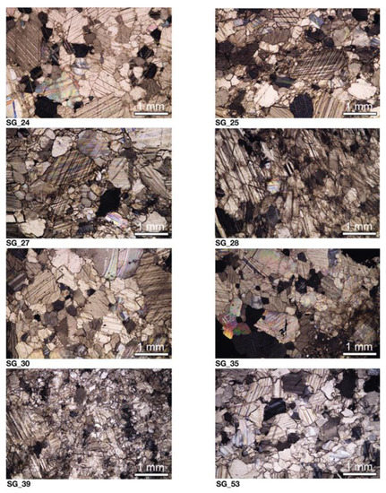 Samples SG_24, SG_27, SG_28, SG_30, SG_35, SG_39, and SG_53 share common characteristics: a heteroblastic fabric and a mortar microstructure made of calcite crystals with predominantly sutured and embayed boundaries (Figure 6a,c–h). The MGS values are over 2 mm in six cases out of seven; they vary from 3.44 mm (SG_53) to 1.77 mm (SG_35; the thin sectioned surface of this sample was the smaller one). Graphite and, often, opaque minerals (hematite, pyrite), such as apatite, potassic mica/phlogopite ± epidote, and quartz, are present as accessory minerals. All these features fit well with those of Proconnesian marble, also known as Marmara Marble, exploited in the Salayar district of Marmara Island (Turkey). The isotopic values (Table 1, Figure 5) support this provenance (Proconnesos-1).