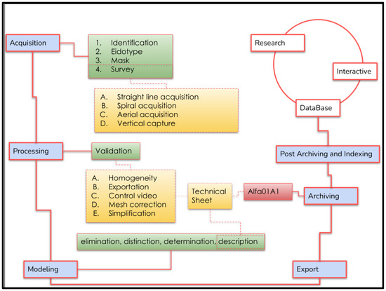 The process of photogrammetric survey relies on conceptualization as a crucial element throughout its phases, with particular significance during the acquisition phase, where the object of survey is understood and conceptual abstraction begins. Digital data curation outlines six distinct phases for data management—acquisition, appraisal, selection, preservation, maintenance, and dissemination. While these phases may not perfectly align with the proposed phases of the BeA-PG protocol, they serve as an abstract reference for its development, with each phase characterized by the phases of digital data curation. Therefore, these phases should be considered as a defining feature of the BeA-PG protocol. It should be noted that conceptualization is a vital aspect of the entire protocol, as a theoretical and methodological framework. The BeA-PG protocol is composed of several phases, which we will describe in detail. These steps are crucial for producing 3D models of cultural heritage and employing them in archives, exhibitions, and interactive virtual contexts. The phases encompass acquisition, processing, modeling, export, pre-indexing, archiving, and indexing. Although these phases stem from digital data curation, they are not entirely identical.