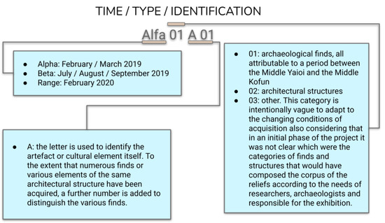 This method allows the creation of reference tables for which data can be easily recovered even in the measure in which, as occurred during the case study, there is a long time between the first acquisition and the first insertion of the data in the database. Furthermore, this leads to the creation of a table in which to communicate the data created up to that point and as the elements that are inserted into the database it is connected with. This intermediate step is meant to eventually be buried as a junction part of the manufacturing process when the database becomes fully operational. This ensures complete traceability of the work (Figure 2) carried out not only from the point of view of the 3D model alone but also from a temporal point of view. Pre-indexing provides all the information on the period in which the survey was carried out, to which category the find belongs, and to which subgroup it has been assigned (Figure 3). This categorization is free from the use of a specific database and is the basis on which digital archives must also be built. As we will also observe, in the practical example reported in the conclusion, this allows not only the traceability and classification of the find, but since it does not depend on any specific database, it allows adaptability and transfer to other contexts as well (thus opposing the problems of obsolescence). Furthermore, this system traces the digital object without requiring the help of specific database glossaries which, although shared, can isolate scholars belonging to disciplinary areas that do not use them.