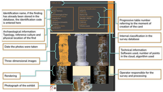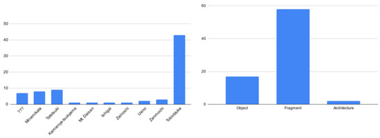 The method described so far, applied in the context of the BeArchaeo project using the times and methods described, has led to the survey of 80 elements, including archaeological finds, architectural structures, and archeozoological finds. To these must be added the survey of the burial chamber of Tobiotsuka Kofun and the survey of the excavation trenches for a total number of further 20 three-dimensional models. Considering an average of 50 photos for artifacts and 100 photos for architectural or environmental surveys, we were confronted with a photographic archive of 5850 photographs, which could be organized, recovered, and recognized thanks to the specific acquisition methods that have been illustrated in the previous paragraphs. The photographs, therefore, led to the elaborations, and even in this phase, for each element, the reference sheet was drawn up with information on the reconstructive algorithm used, the software used, the number of points that make up the surface of the model, and the images of comparison between the 3D model obtained and the original object. In some cases, it was also possible to insert in the cards the three-dimensional model of the find at the time of its discovery, from the excavation directly, allowing it to be associated with the reference stratigraphic unit (this was valid for 29 finds found in the excavations carried out in the Sepulchral Chamber of Tobiotsuka Kofun). This allowed an initial classification by observing the sites of origin of the finds and identifying the most represented morphological categories (Figure 4).