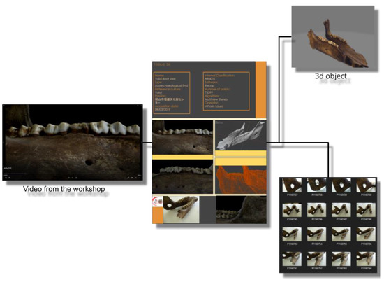 The EU H2020 “Beyond Archaeology” (BeArchaeo) project develops interdisciplinary and multidisciplinary methodological models for the study of the historical relationships between the archaeological areas of Okayama and Shimane [80]. The BEA-PG work phases are sequenced as follows: acquisition, processing, modelling, export, archiving, post-archiving, and indexing. The survey activities were carried out from February 2019 to August 2019 and the elaboration processes took place from August 2019 to May 2022, which led to the exhibition phases of the project, first the Cave Automatic Virtual Environment (CAVE) of the University of Turin (June 2022) and then the creation of BeA-Vir, an interactive system for the Exhibition at Museum of Izumo in Autumn 2022. Considering an average of 50 photos for artifacts and 100 photos for architectural or environmental surveys, we compared a photographic archive of 5850 photographs, which was organized, recovered, and recognized thanks to the specific acquisition methods that we will now illustrate (Figure 1).