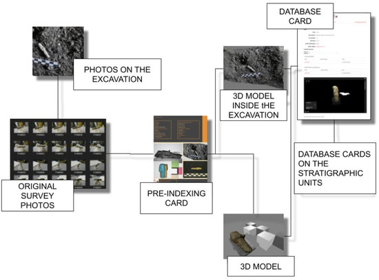 De Reu et al. propose a detailed methodology based, however, on a specific software (in this case Agisoft PhotoScan, AgiSoft LLC, 2011b), which focuses on the exclusive context of emergency excavations; moreover, no space is given in this context to a reflection on the fate of 3D models in the subsequent archiving and dissemination phases [52]. The work poses the problem of information classification and was also created as a clear and intelligible operational workflow for cultural heritage scholars. However, the proposal builds its methodology on specific software. There is not even a specific definition of the acquisition method and the fate of the original photographic data being archived.