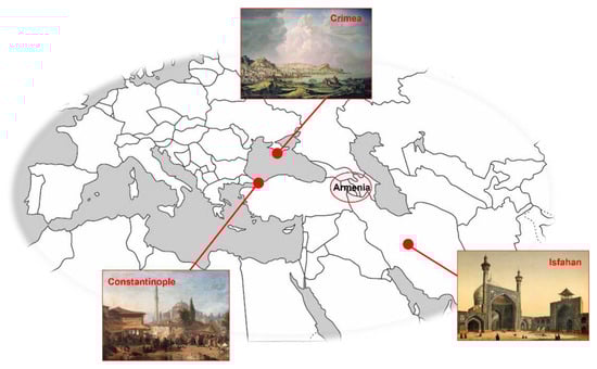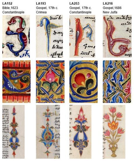As already mentioned, this group of manuscripts was produced within the Armenian diaspora communities of Constantinople, Isfahan, and Crimea, during the 17th century, as shown in Figure 1. These communities were prospering centers of Armenian trade and artistic production patronaged by the wealthy merchant class. The three centers were interconnected through the dynamic mobility of people that promoted the circulation of goods and ideas between them. At the same time, these communities shared wider connections globally, from East to West [4]. The artistic production of this period, developed beyond the historical frontiers of Armenia, is distinguished by its eclectic style. This style is strongly characterized by the continuity of Armenian medieval local traditions and contacts with European art conveyed by the Crusaders in the Latin Kingdoms of Cyprus, Antioch, and Jerusalem. It is in the Kingdom of Cilicia (1198–1375), open to the Mediterranean, that Armenian art has its apogee and where, in the 13th century, flourish the scriptorium of Hromkla (present-day Rumkale, Gaziantep, Turkey), and the legacy of Toros Roslin, scribe and illuminator of seven dated manuscripts. The inheritance of Byzantine and Seljuk art intersects here as well [5]. These broad connections can be particularly observed in the manuscript art of the 17th century Armenian diasporas, where the local artistic traditions are very often conjoined with new westernized inspirations [6,7]. It has been suggested that these diaspora workshops bear influences from traditional Armenian schools, particularly from Cilicia, as well as from Byzantine and Western art [8,9,10]. Therefore, the Gulbenkian group of Armenian manuscripts offers the possibility to study the manuscript production of the last Armenian scriptoria, and to evaluate the art and craftsmanship of miniature workshops of Constantinople, Isfahan, and Crimea.