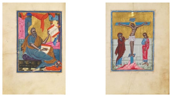 Gospel LA253 (17th century), produced probably in Constantinople (154 × 114 mm), from left to right: “Evangelist Mathew”, f. 28v; “Crucifixion” f. 13r. © Gulbenkian Museum.