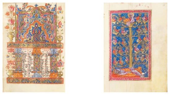 Gospel LA216 (1686), produced in Isfahan/New Julfa (108 × 079 mm), from left to right: “Canon Table” f. 5v; “Tree of Jesse” f. 16r. © Gulbenkian Museum.