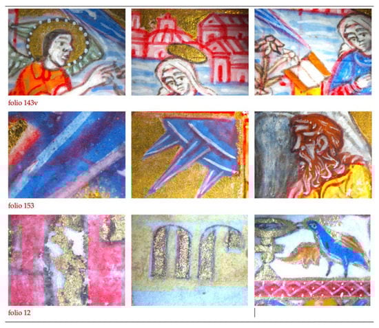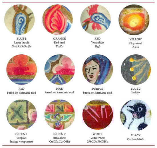 The main colorants used in the four manuscripts studied are the same, and the molecular palette is represented in Figure 6. The painting technique is, however, different, as are different the ways of painting faces, hands, and vestments, which are discussed in Section 2.4. More details on the painting technique are found in Supplementary S1. The areas of analysis and spectral information are described in Supplementary S2 and S3, respectively.