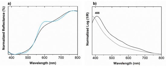UV-VIS reflectance spectra were obtained with an Ocean Optics, MAYA 2000 Pro reflectance spectrophotometer equipped with single beam optical fibers and a Hamamatsu linear silicon CCD detector collecting spectra in a 200–1060 nm spectral range. The light source was an Ocean Optics HL-2000-HP halogen lamp, with 20-W output and 360–2400 nm spectral range. Analysis was conducted with a 8-ms integration time, 15 scans, eight box width, and 45°/45° reflection angle to the bearing surface, with a 2-mm spatial resolution. A Spectralon® white reference was used for calibration. While being acquired from 350 to 800 nm in reflectance, the spectra are shown as apparent absorbance, A’ = log10 (1/R).