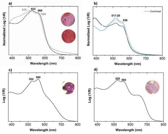 Apparent absorbance spectra of paints based on anthraquinone dye of animal origin: (a) pink color (black line) and red color (grey line), from LA193 p. 32; (b) applied as a preparation ground for gold, in LA216 f. 4r (black line) and as writing ink, in LA193 p. 168 (grey line), compared with a paint based on American cochineal (blue line); anthraquinone-based paints admixed with a blue colorant: (c) LA216 f. 4r and (d) LA193 p. 168.