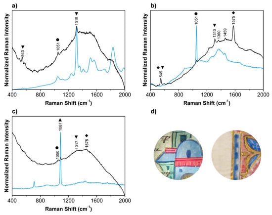 Raman spectra of the blue colors (black lines) are compared with references (ref.) (blue lines), prepared as gum arabic tempera and applied in parchment, for: (a) LA152, a mixture of lead white and lapis lazuli compared with lapis lazuli ref.; (b) LA193 and LA253, a mixture of lead white, lapis lazuli, and indigo compared with lead white ref.; (c) LA216, admixed with calcium carbonate lead white compared with calcium carbonate ref.; (d) details of the illuminations in LA193 (left) and LA216 (right). The main bands detected are assigned to lapis lazuli (▼), indigo (◆), lead white (●), and calcium carbonate (▲).