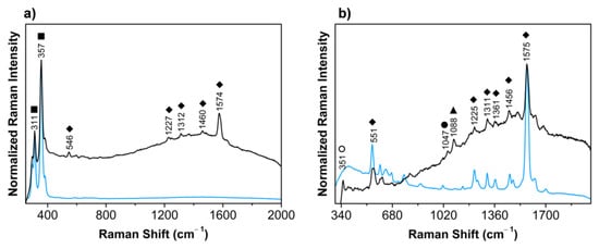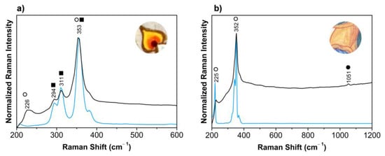 Orpiment and mixtures of this colorant with realgar and lead white were identified for the yellows. Raman spectra for the yellow colors (black lines) are compared with references (blue lines) for: (a) LA252 and LA216 as a mixture of realgar and orpiment; (b) LA193 as a mixture of realgar and lead white. The main bands detected are assigned to realgar (○), lead white (●), and orpiment (■).