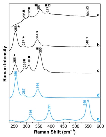 The red and orange pigments are identified as vermilion, the most used, and mixtures. The Raman spectra of three orange colors (black lines) found in: (a) f. 11v of LA216, as a mixture of orpiment and minium; (b) LA152, LA193, and LA216, as a mixture of vermilion and minium; (c) in LA152 and LA216, as orpiment with vermilion. The main bands detected are assigned to vermilion (★), orpiment (■) and minium (□). References (blue lines), prepared as gum arabic tempera and applied in parchment, for (d) vermilion and (e) minium.