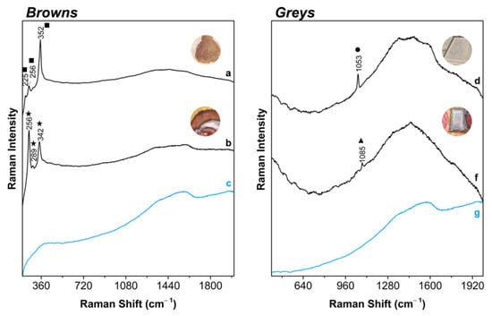 Raman spectra of the browns (left) and greys (right). The browns resulting from the mixture of carbon black with: (a) orpiment were found in LA193 and (b) vermilion was found in all the manuscripts. The greys were obtained using carbon black admixed with a white compound: (d) lead white in LA253 and LA216; (f) calcium carbonate for LA216. The main bands detected are assigned to orpiment (■), vermilion (★), lead white (●) and calcium carbonate (▲). Carbon black reference (blue lines), prepared as gum arabic tempera and applied in parchment, (c,g).