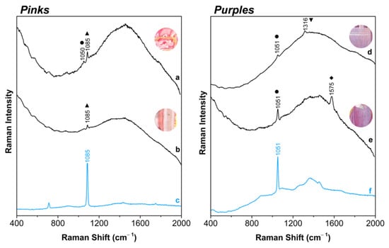 Raman spectra of the pinks and purples. The organic pinks were applied with (a) lead white and calcium carbonate in LA126 or with (b) calcium carbonate alone. The purples result from the mixture of a red dye and: (d) lapis lazuli in LA152 and LA216, (e) indigo in LA193 and LA253; and, except for LA216, all the paints present as additive lead white. The main bands detected are assigned to lead white (●), calcium carbonate (▲), lapis lazuli (▼), and indigo (◆). (c) Calcium carbonate and (f) lead white references (blue lines) are prepared as gum arabic tempera and applied in parchment.