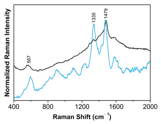 Raman spectrum of iron-gall ink found in f. 1210r, from LA152 (black line) and reference spectra of a reference iron-gall ink (blue line). This Raman spectrum is representative of iron-gall ink signals of all four manuscripts.