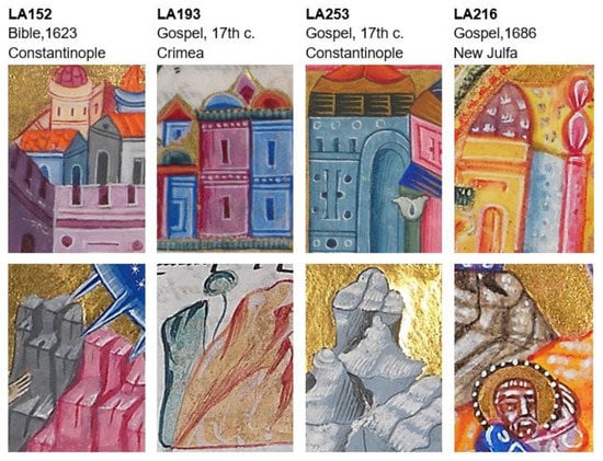 Drawing lines and brushstrokes are delicate in LA152, LA253, and LA193, while they are thick in LA216, possibly because of the small dimensions of the book. A similar approach was also observed in the minute illuminations of a book of hours [53], as shown in Supplementary S1 (Supplementary S1.6). White is used to highlight the ornaments, vestments, mountains, and architectural details in all four manuscripts (Figure 17, Figure 18 and Figure 19). More information on painting techniques is available in Supplementary S1.