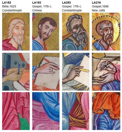 A preserved Armenian painters’ manual from 1618 (BnF MS Arménien 186) describes some drawing techniques that are traceable in our manuscripts [51,52]. These include mixing ochre with black and drawing the faces, hands, and feet, then re-drawing them with purple, or drawing with black and then shading it with red. It also suggests lightening the faces with a mixture of purple and white, or modeling the facial features by applying white and red on the noses, cheeks, foreheads, mouths, necks, hands, and feet. The manual mentions paint mixtures as well: red with black for deep purple, red with white for light red, red with lapis lazuli for light purple, red with indigo for medium purple, indigo with yellow for dark green, and lapis lazuli with yellow for light green. Finally, to create shades, it suggests indigo for lapis lazuli, light green for dark, and carmine for red.