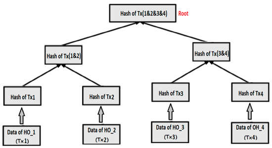 Therefore, if we try to store all these data “on chain” how could such an act be achieved? Let us suppose that each element (with all its attached files) consists of a unique transaction (each transaction will be symbolized as “Txi”, where I = 1, 2, 3, etc.). For instance, the transaction which has been created from a certified employee of the Ministry of Culture of a member country (a unique subsystem of the ecosystem) is going to be the “Tx1”. If the data have not been maliciously modified, then the signature check will be completed successfully and afterward, it will be combined with the hash value of another element (for example, Tx2) in order to create a Merkle tree [57], such as the one shown in Figure 8. This Merkle tree consists of the data of the elements which will be saved in a specific block. Thus, if we take into consideration the information which was analyzed in the previous paragraph regarding the size of each element, we understand that after a short time, the size of the blockchain will be very difficult to be managed. In other words, if we try to search a specific element in order to read its data, the server’s response time will take too long.