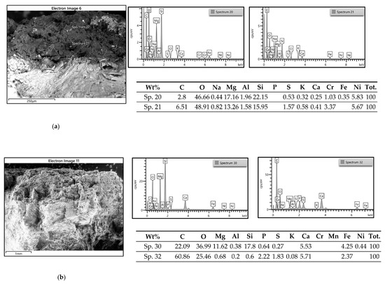 The chemical composition of the pietra ollare samples (Figure 8) is generally different from that of the encrustations (Figure 8b–d), with traces of possible contamination between the two, limited to the interface zone between them (Figure 8a). This confirmed that the findings in the encrustations are, in general, unrelated to the stone of the vessels.