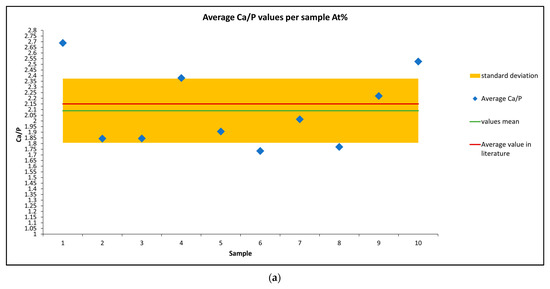 Table 5 and Table 6 and Figure 9 provide the Ca/P ratio data. In particular, the total average ratio calculated is close to 2.15 (Figure 7). Deviations from this value could be explained by diagenetic factors and by differences in the age of the individuals at the time of death. The data are within the values reported in the literature from the analysis of bone material of both human and animal origin [33,34,35,36,37], which also fall within the range 1.6–2.58, indicative of the presence of bone material [36]. Lastly, exposure to heat (i.e., firing) does not seem to cause changes in the quantities of the elements [36], so the firing of this bone material did not alter the ratio.