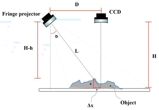Fringe projection is a three-dimensional reconstruction method used to generate a 3D digital model of an object with excellent accuracy and simplicity [29,34,35,36,37,38,39,40,41,42]. A typical setup for a fringe projection system consists of a projection unit (projector) and an image acquisition unit (CCD camera), as shown in Figure 1, as well as an analysis system (computer). The camera is placed perpendicular to the plane where the object under study is located at a distance H. The projector must be situated on the camera axis at a distance D and angle α.