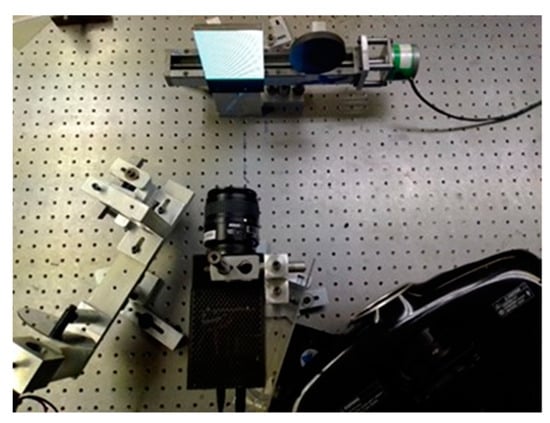 In the previous section, we described the geometrical arrangement of the method; here, we describe the specific configuration used in our experiments. Following the geometry shown in Figure 1, the distance between the reference plane and the camera lens was 24 cm, the illumination angle of the projector was 30° (α), and the distance between the projector lens and the object was 39 cm. Figure 3 shows the equipment used. In this arrangement, we used a Lumenera® LW11057M high-resolution camera (4008 × 2672 pixels) with a Nikon 60 mm focal length lens and a multimedia Epson EH-TW6100 high-resolution video projector (1920 × 1080 pixels). The fringe periods varied from 0.5 to 8 mm. For all images, we employed four equally spaced phase shifts: 0, π/2, π, and 3π/2.
