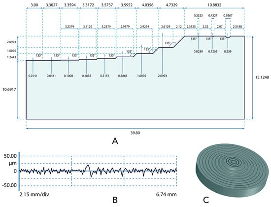 Circular pyramid (8 steps) used to test fringe projection. This pyramid was manufactured from Nylamid® using a lathe. The top step has three concentric channels which were useful for plane calibration. (A) Detailed diagram of the size of the steps and concentric channels. (B) Roughness profile. (C) Rendering of pyramid.