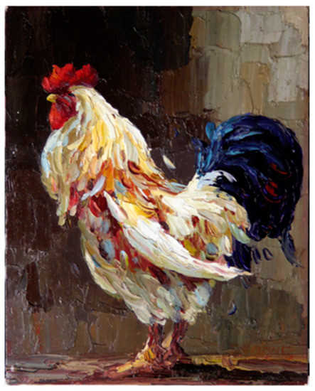 The painting used in the experimental procedure, The Rooster, is an oil painting on linen canvas painted in part using a spatula technique. It was painted by Pablo Gonzales in 2001 and is 30 cm wide by 40 cm tall. Figure 5 shows a color image of The Rooster.