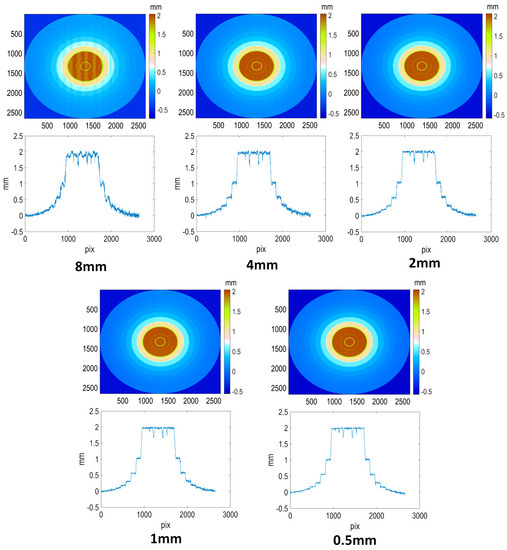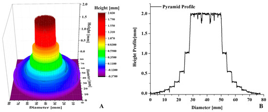 The circular pyramid was fabricated with highly accurate step heights. The pyramid is shown in Figure 4C. It had eight steps, with heights of 2.0993 mm, 1.0895 mm, 0.5855 mm, 0.3151 mm, 0.1836 mm, 0.1008 mm, 0.0441 mm, and 0.0141 mm. At the top step, there were three concentric channels with widths of 0.9267 mm, 0.4327 mm, and 0.2325 mm. These channels were used for the “x” and “y” calibration. A detailed diagram is shown in Figure 4A. The heights of the steps and the roughness were accurately confirmed using a high precision digital 3D-touch BFWA 10–45–2/90° roughness meter probe. The accuracy of the height of the pyramid was 25 µm. A profile of the roughness is shown in Figure 4B.
