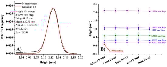 (A) Distribution of heights for the 2.0993 mm step using the fringe with 0.5 mm period. Measured heights are shown in black and the best fit of a normal distribution in red. (B) Means and standard deviations of all steps and periods.