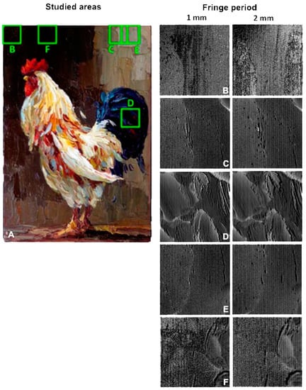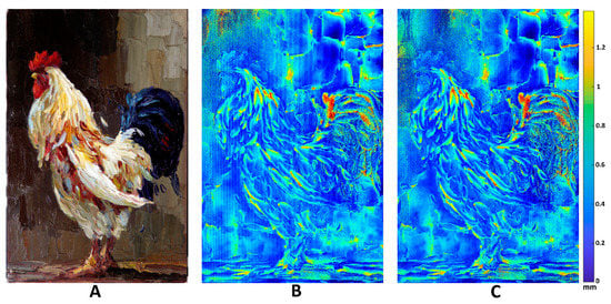 To show the application of the method, we captured the complete work with two fringe periods: 2 mm, as shown in Figure 9B, and 1 mm, as shown in Figure 9C. We discuss the process at two scales: analyzing the complete model (global) and analyzing a region (local). In the global analysis, we can see that both photographs clearly show where there is thicker paint, applied with a relief effect that results from the angles of the spatula. The texture is relatively thick, for example, in the tail of the rooster. With respect to these characteristics, at the scale considered, there are no distinguishable differences. However, if we perform an analysis focused on certain regions of the painting, we can observe a notable difference between the models. An example can be seen in the upper left corner of the painting.