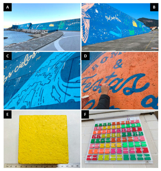 The urban mural selected for evaluation of the colour protectors, called A Guarda Escrita Nas Estrelas, was painted in August 2018 by the artists Nuvi and Éxfico on the northern harbour wall in the port of A Guarda (NW Spain) (Figure 1A,B). The harbour wall extends southwards (N220°) and is of length 220 m. It consists of three sections constructed from reinforced concrete slabs and is protected on both sides by a breakwater made of concrete blocks. The southernmost section, where the harbour traffic lights are located, is semicircular; the middle section is 170 m long and has three high steps (up to 12.5 m), while the northern section, of length 50 m, has two steps (up to 8 m high). The mural was painted on the inner harbour wall, which faces the port and is oriented ESE, and on the circular end, oriented NNE.