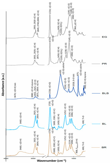 FTIR analysis also confirmed the nature of the inorganic fillers detected by XRD: rutile was identified in the BR and BL paints by a band at 690 cm−1 (Ti-O) [60]; calcite was identified in the BLB paint by bands at 1420 cm−1 -ν(C-O)- and 875 cm−1 -ν(C=O)- [56]; talc was identified in the BLB paint by bands at 3670 cm−1 -ν(O-H)- [56,61] and 1018 cm−1 (Si-O) [56], and goethite was identified in the BR paint by a band at 908 cm−1 -δdeform(O-H) of Fe-OOH- [62,63].