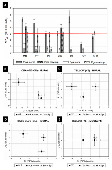 Plots of colour parameters in painted surfaces with protector coatings to analyse the colour change cause by application of the protectors. (A): mean values of ∆E*ab caused by the Proa and Ega protectors on the paints in the mural and in the mock-ups. (B–E): mean values and error bars for L* and C* parameters in the paints without protector and with the different protectors: orange OR paint in the mural (B), yellow YE paint in the mural (C), blue base BLB paint in the mural (D), and yellow YE paint in the mock-ups (E).