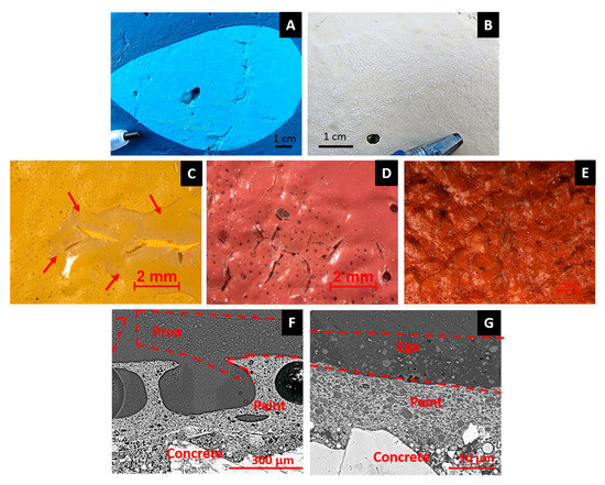 (A,B): images of the surface of the blue base BLB (A) and the brown BR (B) paints in the mural after application of the Proa protector. (C–E): stereomicrographs of mock-up surfaces with Proa protector on yellow YE paint (C) proa protector on pink PI paint (D) and Ega protector on pink PI paint (E). (F,G): scanning electron micrographs of mock-up cross-sections of the Proa protector on pink PI paint (F) and the Ega protector on orange OR paint (G).