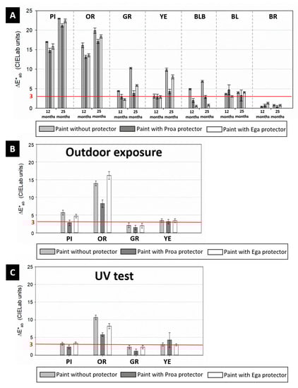 In the UV exposure test (Figure 5C), the changes were similar to those observed in the outdoor exposure test (Figure 5B), although the ∆E*ab values were, in all cases, slightly lower.
