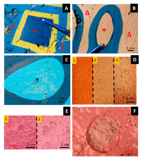 The ∆E*ab values for the paints on the mock-ups with and without protectors (Figure 5B,C) showed some similarities and differences relative to those in the mural. In the outdoor exposure test (Figure 5B), the ∆E*ab values for the OR paint were similar, and again higher than three CIELab units: without protector, the ∆E*ab value was 13.94 ± 0.69 units, similar to that obtained in the mural after 12 months and with both protectors. Neither protector was therefore very effective in protecting the colour of this paint in the outdoor environment, as can be seen in the images in Figure 6D, in which the surfaces on the OR paint with and without protector have faded in a similar way. However, in the mock-ups of PI paint with and without protector, the colour change after the outdoor exposure test was different from that in the mural: the ∆E*ab for the PI paint without protector was only 5.69 ± 0.64 CIELab units (Figure 6B), which is much lower than the value obtained in the mural after the same exposure time (12 months) (22.97 ± 0.11 CIELab units) (Figure 6A). The layer of Proa protector applied to the PI paint in the mock-up reduced the ∆E*ab to below three CIELab units (Figure 5B) after 12 months, unlike in the mural, in which the corresponding ∆E*ab was 14.82 ± 0.56 units after the same exposure time (Figure 5A). In the same paint treated with Ega, a visible colour change was observed at the end of the test (Figure 6E) and greatly affecting the inside of the numerous broken bubbles covering the surface (Figure 6E,F). These bubbles were formed during the paint application process, and the protectors were applied on top of them (Figure 6E(1)); during the exposure test, the bubbles burst, leading to detachment of the protective coating and leaving the paint surface exposed and thus causing greater loss of colour than in the rest of the sample (Figure 6E(2),F). Finally, the colour change undergone by the other two paints (GR and YE) with and without protector was quantitatively similar to that observed in the mural after the same period of time.