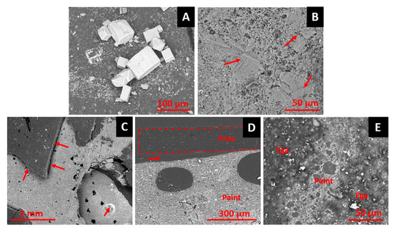 - The existence of saline deposits on the surface of the mural and the mock-ups exposed outdoors (mural and outdoor exposure test), specifically Na- and Cl-rich crystals with a cubic habit, typical of halite (Figure 7A), and acicular, subidiomorphic Ca- and S-rich crystals (Figure 7B), which would correspond to gypsum; these salts are derived from marine environments, specifically from marine aerosols [25,55]. These deposits will undoubtedly contribute to the colour change; however, greater amounts of deposits were not found in the samples that changed most in colour. The presence of diatoms, which are common in freshwater surfaces, was also detected.