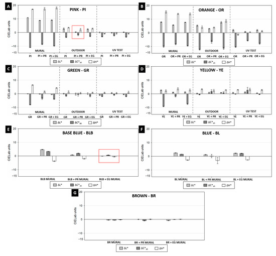 (A–G): bar charts showing the ∆L*, ∆C*ab and ∆H* values for the paints in the mural after exposure for 25 months and for the mock-ups after exposure for 12 months (outdoor exposure test) and 4620 h of irradiation (UV aging test). Red rectangles indicate cases where the products provided some degree of protection.