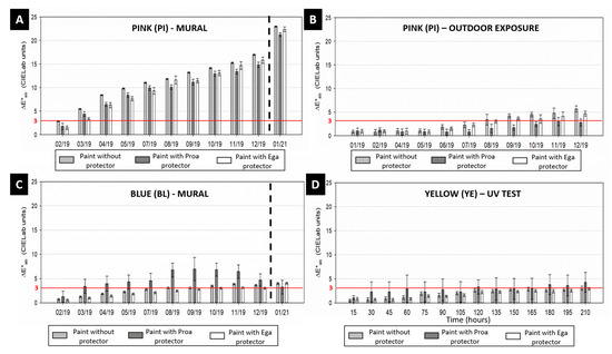 Bar charts showing the temporal evolution of ∆E*ab. (A): pink PI paint in the mural. (B): PI paint in the mock-up after outdoor exposure test. (C): blue base BLB paint in the mural. (D): yellow YE paint after the UV test.