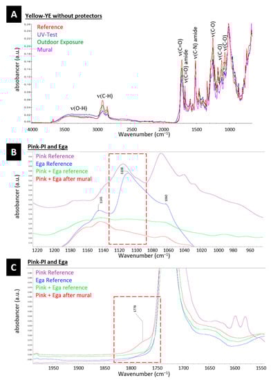 - Considering only the paints without protector, in the PI paint, the absorption of the bands at 2925 and 2854 cm−1 -ν(C-H)-, 1720 cm−1 -ν(C=O)- and 1252, 1114 and 1066 cm−1 -ν(C-O)-, associated with the polymer, decreased, particularly in the mural samples. The changes therefore corresponded to the intensity of colour changes, which were greater in the mural and lower in outdoor and UV tests. This also occurred in the YE paint (Figure 10A), with the decrease in the absorption of the bands being greater in the mural and lower in the mock-up samples subjected to the UV and outdoor exposure tests, although these differences are not consistent with the intensity of the colour changes; however, the values obtained were low and similar for the three types of exposure (3.14 ± 0.51 CIELab units for the mural, 3.04 ± 0.43 CIELab units for the mock-up sample in the UV test and 3.42 ± 0.50 CIELab units for the mock-up sample in the outdoor exposure test). In addition, in the spectrum of the YE paint on the mock-up in the UV test, an increase in the absorption band in the -ν(O-H) region (at 3100–3600 cm−1) and a shoulder of the carbonyl absorption extending to wavenumbers above 1750 cm−1 were detected (Figure 10A); these observations may be compatible with the formation of oxidation products of the alkyd component [67,68,69]. In the spectrum of the YE paint there was also a decrease in the absorption of the bands at 1670 cm−1 -ν(C=O) amide- and 1515 cm−1 -ν(C-N) amide-, with the decrease being greater in the mural; these peaks correspond to azo pigments present in this paint [19,58].