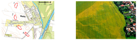In spite of the high potential of ARS for detecting field fortification sites it is necessary to keep in mind that the knowledge acquired via ARS on fortifications stems from the specific environmental (soil and subsoil, or quaternary geological) conditions, and that it is therefore geographically focused on landscapes with a permeable gravel–sand subsoil, where arable land continually erodes due to plowing and the slant of the terrain, which positively influences the creation of cropmarks above the sunken features. It is thus wholly legitimate to assume that other sites that are no longer discernable in the terrain can be also discovered in greater or lesser concentrations elsewhere. However, these sites can be found in other ways, primarily by surface survey in connection to reports of diplomatic and narrative origins in historical documents, as well as evidence in the oldest military maps, but also via modern remote-sensing methods. This includes the use of multispectral and thermal sensors placed on drones in order to record field surfaces in which sunken features appear in the form of visibly developed vegetation marks. However, this takes place at irregular intervals: sometimes annually, sometimes only once in many years [62,63,64,65].