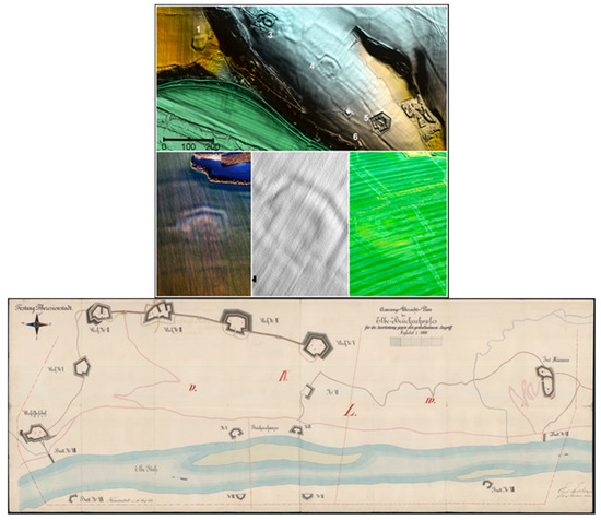 The majority of field fortifications from the 17th to the 19th century are physically preserved in the forested environment (i.e., in the terrain relief), where these sites were exposed to less intensive human pressure after their abandonment and were located in agriculturally less fertile positions of uplands, highlands and hilly regions, suitable for cattle grazing rather than the cultivation of arable land. The process of gradually levelling the walls and ditches of fortifications did not follow the same pattern as the one observed in fortresses located in lowland, open landscapes. One of the best-mapped and most thoroughly studied areas using landscape archeology methods showed a heightened presence of field fortifications is the Tachov region (wider surroundings of Planá) in West Bohemia. This landscape is linked to the clashes between the Imperial and Swedish armies at Třebel at the very end of the Thirty Years’ War [41]. The application of ARS methods in the type of environment described above is linked to the combined use of aerial laser (lidar) data, old maps and the results of surface (topographic) surveys. A number of similar projects in the Czech Republic and abroad have shown the potential that the integration of these aforementioned resources offers [42,43,44,45]. Refer to [46] for a study of military sites in the context of the Thirty Years’ War; to [47,48] for studies of the period from the 17th to the 19th century; and [34] for general information on the aforementioned integration, including three examples of studies dealing with two prehistoric and one modern monuments.