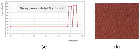 Two dyeing circles were performed for each material. The first was undertaken according to the recipe and the second was performed by changing variables such as the mordant procedure and the amount of the dyestuff, the dyeing temperature, and the kind of fabric used in order to produce different shades, providing a valuable database and reference point for further research. An example of dyeing procedures regarding time and temperature is given in Figure 3.
