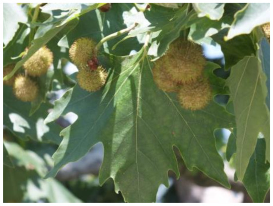 Platanus orientalis L. Oriental plane, (Greek: πλάτανος) fruits and leaves (photo taken by the authors 2013 at Abelakia Greece).