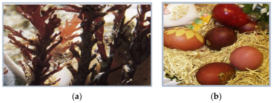 Existing documentation indicates that exactly the same materials and similar dyeing techniques were used in various areas of Greece, even in other countries [16]. In the island of Nisiros, for example, Rytiphloea tinctoria (Clemente) C.Agardh, a kind of algae (Figure 5a), was used to achieve shades of red. In Cyprus3, hundreds of miles away, it was mentioned as being used for the same purpose. The use of the same algae in Kefalonia for egg decoration (Figure 5b) is a matter of common knowledge even to the present.