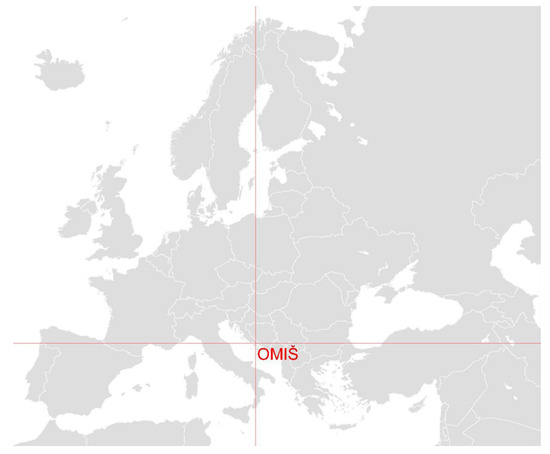 Location of Omiš (Based on: https://upload.wikimedia.org/wikipedia/commons/0/0c/Blank_map_Europe_with_borders.png; San Jose, public domain, via Wikimedia Commons, accessed on 29 January 2023).