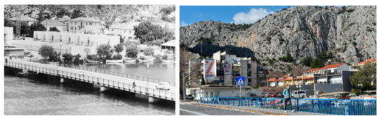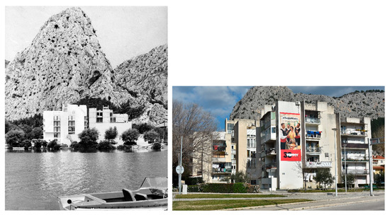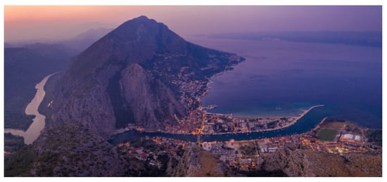 Croatian modern architecture represents a focus of many professional and scientific studies within Croatia, and to a degree internationally. Since the second half of 20th century, it has been continuously presented and published in professional and scientific journals (Čovjek i prostor, Arhitektura, Prostor, Oris, etc.) [2,3,4], books, internet sites, scientific projects, etc. It has recently been internationally recognized: for example, at Venice Biennale, curated by Professor Karin Šerman in 2014, focusing upon 100 years of Croatian architecture within the exhibition curated by Rem Koolhaas, and the exhibition “Toward a Concrete Utopia: Architecture in Yugoslavia 1948–1980,” organised by Martino Stierli, held at the Museum of Modern Art (MoMA) in New York (2018–2019) [5,6]. This paper focuses on the, so far not sufficiently focused upon or integrally researched, architectural Modernism of Omiš, a city situated on the east coast of the Adriatic Sea, some twenty kilometres from Split, a major centre of the area. The small City of Omiš and its modernist layer has so far been omitted as a site of complete research. An exceptional topography of the terrain, coupled with a natural beauty, characterises this part of Dalmatia (Figure 1).