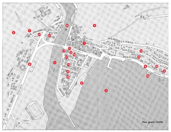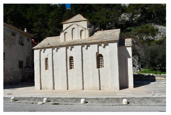 - Kovačić, V. Urbanistic Development and Architecture. In Omiš and Poljica; Domljan, Ž., Ed.; The City Museum and the Omiš Tourist Board: Omiš, Croatia, 2006; pp. 213–241. [Google Scholar]