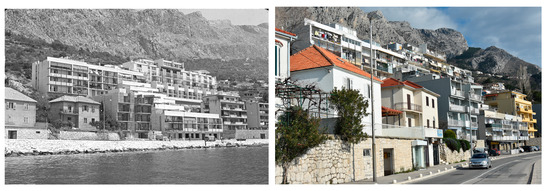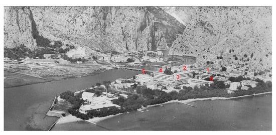 The development of industry started the process of the urbanization of Omiš and intensive housing construction was undertaken under the supervision of the municipal authorities. In 1959, these issued two important documents that designers of residential buildings in the area of Omiš Municipality had to adhere to: first, the Guidelines and Program of Residential Construction and Orientation, and second, Rational Design of Residential Construction [16]. Similar documents were used by planners in other cities of the country at the time [17,18,19,20,21]. Documents for civilian buildings, such as those in Omiš, and for buildings built by the Yugoslav Army, differed [22].